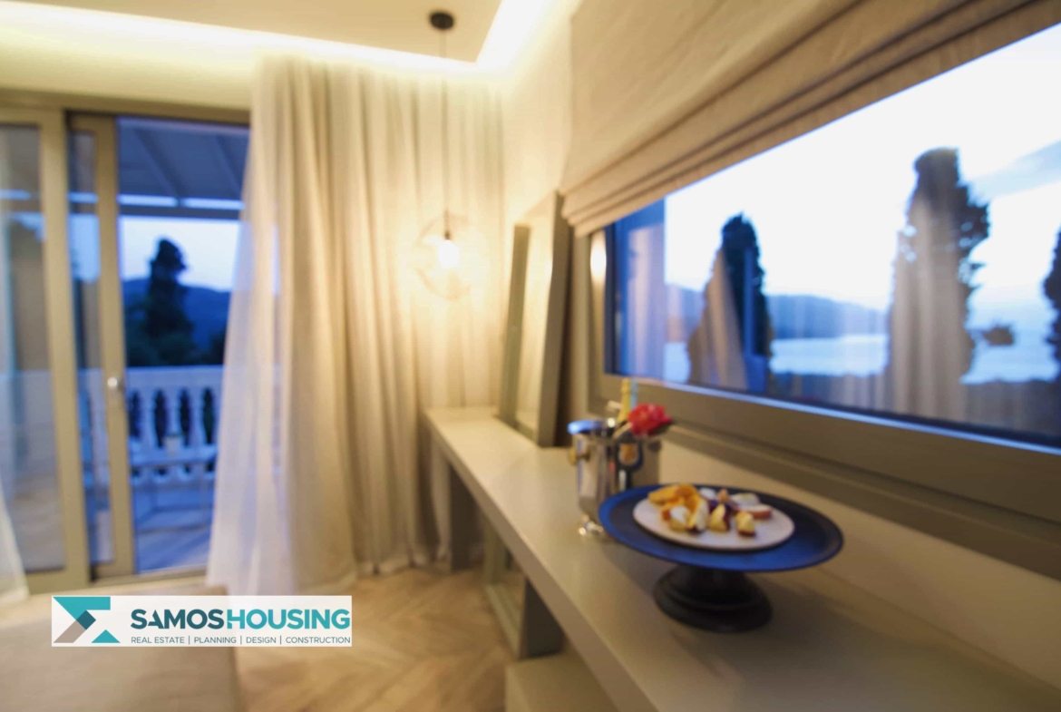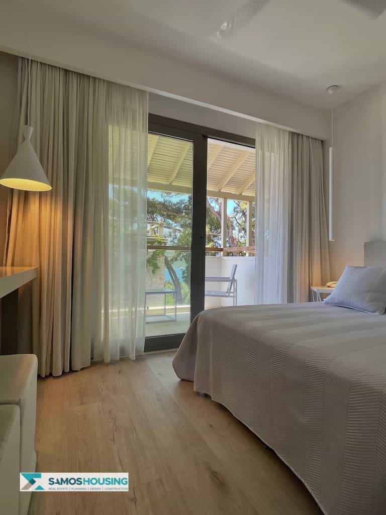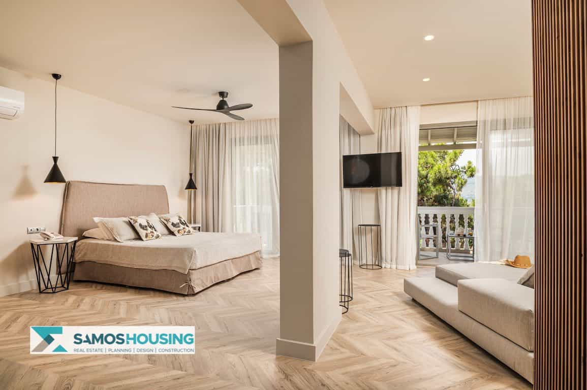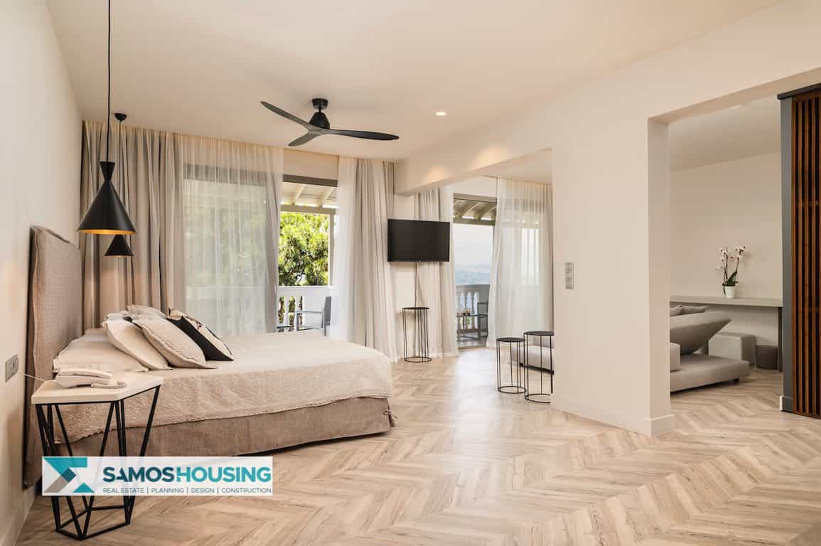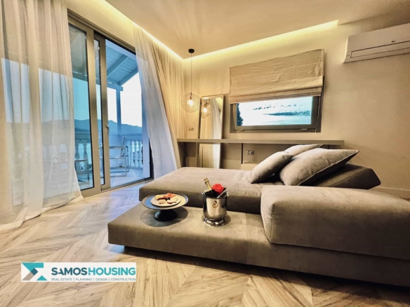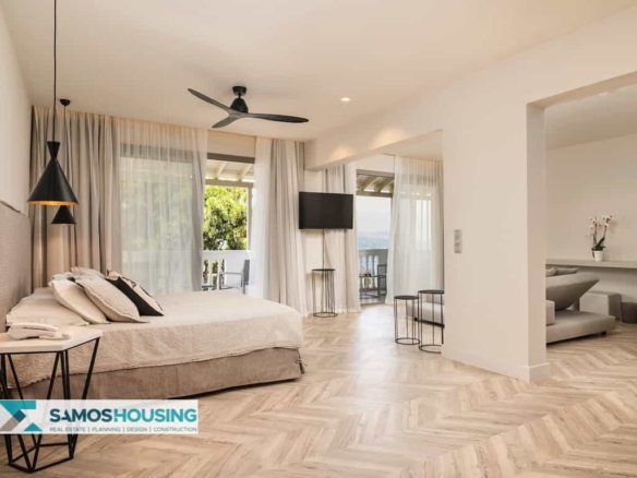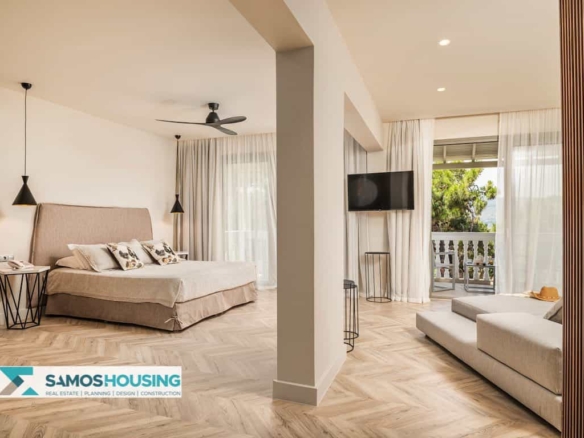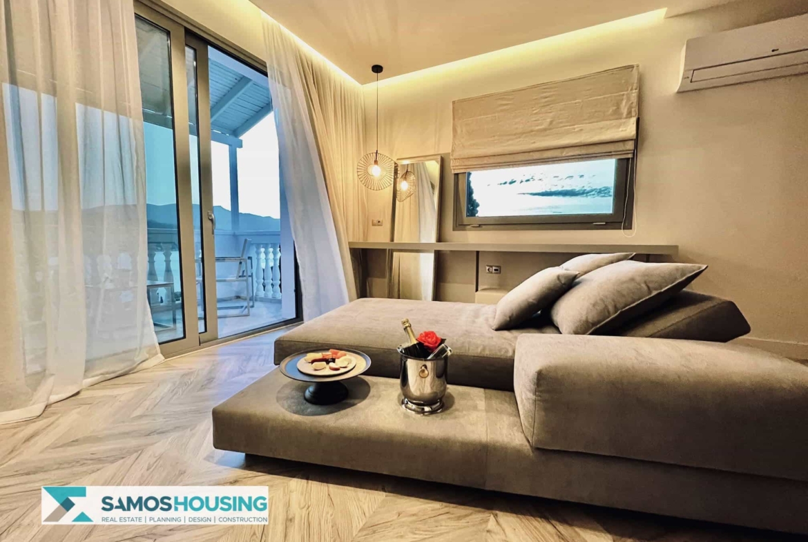 Set in the chic Kalami area, the property enjoys both serenity and accessibility. Kalami itself is only minutes from Samos Town and the bustling port. Gangou Beach is a short, two-minute walk from the hotel’s door. Restaurants, bars, shops, and all the town’s venues are close, yet privacy and tranquility rule the surroundings. This is a central advantage for guests and investors seeking Samos Real Estate.